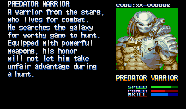 | The Predator Warrior is a great character: he uses a spear as the basis for most of his moves, a shoulder cannon, skill, and agility. The Predator Warrior is the perfect character to use for wreaking massive amounts of havoc upon the opposition; Predator Warrior's moves are agile and combo easilly, and it's easy to get from one point on the screen to another quickly with his moves, similar to Maki in Final Fight 2. To start, Predator Warrior's plethora of moves are just brutal as all hell; his jump kick, if performed correctly, can combo 3 times and then shortly after, in a split second, change course and finish the opposition with 2 more hits in the opposite direction (think of a 'Z' path of movement here), and if that wasn't enough, he can still juggle them if they bounce off the wall. What's even better is that if you miss the last 2 hits completely (of either one of his two lead-in jumping attacks), you can still catch them in the whole ground link combo when you land! Truly fucking spectacular, and perfect for wreaking bloody havoc upon herds of Aliens at a time. Also a great move for taking out several enemies in one sweep is his Leaping Kick, which only hits twice, but if put into a combo can be fatal, and it also has the benefit of sending the enemies across the screen, close or far. To go with the already great selection of moves, the Predator Warrior, when he loses his spear, can fight with his fists, changing other moves, and changing to a completely different ground combo that ends with a nicely drawn short leaping kick finisher. In addition to ground combos and jumping attacks, he also has a slide that is readily available to hit low enemies like facehuggers, and a turn-around sweep that is used as a sort of counter (very effective to buy a few crucial seconds of time). Another of his great skills is his screen-clearning Special Move, which is actually a Spear Cyclone that's quick and has nice animation; dust and victims grace the screen in 2-D splendor, but even the dreadlocks on the Predator Warrior move with the environmental effect of the cyclone when he does this move! One of his other Special Moves is aesthetically spectacular - Predator Warrior leaps into the air, and with a slight pause, fire his shoulder cannon into the ground, leaving all in bright flames. The Predator Warrior is all about technique, and there's so many different moves you can do with him that fans of Guy and Maki (of Final Fight fame) would pick him up in an instant and feel at home. By far, my favorite character in this game, due to the greatness that is everything Capcom's designers put into the Predator Warrior's complete persona. A brilliant character Capcom's artistic staff did an amazing job on; no matter the Predator Warrior's walking, action, or combo animation, all is exceptional. | |