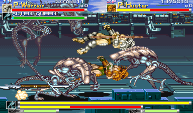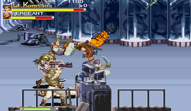 | The gameplay is of the side-scrolling fighter type aforementioned, with vertical and horizontally scrolling stages chock-full of bloodthirsty enemies to face. The stages, as in all other side-scrolling fighters, have mid-bosses and bosses in addition to the various expendable runts that you often plow through. No side-scrolling fighter is complete without an opposition to systematically eradicate, and this is yet another area in which AVSP excels in. This game has as many enemies as there are drops of water in the sea; well, maybe not that many, but the game does have a more than generous amount of opposition to wreak havoc on. AVSP pits you against legions and legions of Aliens like Warriors, Stalkers, Smashers, Arachnoids, the classic Face-Huggers, and Royal Guards. Some of the Aliens are smaller and don't push much weight unless in groups, but others, like Razor Claws, or Crystalis, are roadblocks and can easilly make short work of any of the four heroes if they slip into a mistake. As the game progresses though, bigger roadblock enemies are usually accompanied by the smaller, more agile ones, making for tough situations. The enemies aren't limited to the Aliens, however, as you are often fighting against waves of badgering soldiers toting Pulse Rifles, Smart Guns, Knives, and Grenades. As if an assault of eight hellbent death soldiers wasn't already bad enough, you also have to worry about the Power Loaders, which is essentially a soldier in a machine that seems to apparently be used for 'loading,' but is instead used to kick your ass in more ways than one; and although slow as death, these assholes can charge with invincibility, grab, squeeze, hit, and toast you with a mounted flame-thrower. Each enemy possesses their own unique attacks just as the punks in Final Fight and other side-scrollers, some block attacks, while others heave grenades or spit poison. The bosses and enemies aren't just mindless drones like the assholes you see in any Chuck Norris Sunday programming; they can do jumping attacks, dash attacks, spit acid, headbutt, perform holds, claw, and wreak havoc via calling for backup. | |