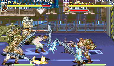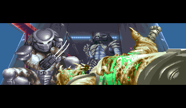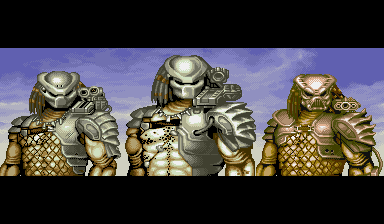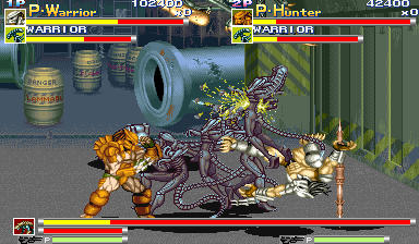 | Of all the enemy detail and style in this game, the most surprising and noteworthy is how AVSP has an elevator stage that scrolls upward just as Rolento's stages in the Final Fight games, with bosses that resemble that of Rolento himself! After the ride starts, the most amazing boss in the game drops from above, appearing on the railing of the elevator - the Mad Predator. Yes, you heard right, not only do you have to cut your way through the legions of Aliens and gun-down a path through soldiers, you also have to face equally deadly opponents who use attacks similar to that of Rolento in the Final Fight series! As stated previously, AVSP has some things in common with Final Fight; the Mad Predators, similar to Rolento, have shadows and walk very fast, can perform wall-dive attacks, holds, and climb on the background railing to mount air devastating air attacks. The Mad Predator is essentially a maskless, pissed off Predator out to give you shit. This boss seems to have been modeled after Rolento; the Mad Predator's leap attacks from the railings, insanely quick ground attacks, amazing agility, and shadow trails will definately make fans of the great Final Fight series happy. In fact, just as Rolento litters the screen with grenades when his lifebar is a bit less than desirable, the Mad Predator drowns you in a screen of fire from his shoulder cannon. It's just nice to see that they put something so great from the Final Fight universe into a game with already outstanding design; the acute similarities the Mad Predator shares with Rolento are great. For those who thrive on consistency and wonder why I had previously explained the boss encounter of the elevator stage in plural, it's because if there are two players there are two Mad Predators as opposed to the single Mad Predator that graces the screen during a single-player journey. The design of the Mad Predators is great because the color palettes used for both of the characters, lacking a mask, looks great to see given credit for variation. As seen below, the Mad Predators look slightly similar to the Predator Warrior and Hunter, but are more agile, lack spears, weild stronger and different single-hit attacks, and have shadow trails (just like Rolento). Absolutely, by far, the height of greatness in this game due to its Final Fight referencing. | |