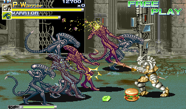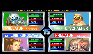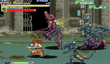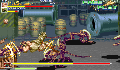 | As Capcom progressed on from their CPS-1 to their more powerful CPS-2 hardware, one of the first side-scrolling fighters in addition to Dungeons & Dragons Tower Of Doom and Armored Warriors was Alien VS Predator. Yes, you heard right - the Japanese developer Capcom, responsible for the greatness that is Street Fighter (in all of its incarnations), developed the game. Alien VS Predator features beautiful character design and brilliant animation (thanks to the great CPS-2 hardware) that still has yet to be rivaled today by any of the next-generation releases, and features the chaotic side-scroller gameplay style of Final Fight with various characters to choose from to fight with. The Predators have come to settle a score with the Aliens, and you have been thrown into the core of a bloody, fierce battle between the two fighting sides. Utilizing the same method of side-scrolling fighting as the Final Fight series, you fight for the Predator's side in the theme - punching, slashing, tearing, piledriving, and shooting your way through stages infested with various Aliens and other enemies that weild attacks, weapons, and techniques just as lethal as yours. Also just as in the legendary Final Fight series, each fighter has several different moves and special moves to systematically eradicate the enemy, each performed by their corresponding button and motion combinations similar to that of other fighters. There is so much to like in this game. | |