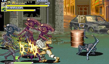 | The fighting action in this game is a white-knuckle experience; on most occasions, the screen is filled with legions of enemies, and there's nothing better than busting a combo on 4 enemies at a time. When two players go at it together, the brawl-fest gets furious, often littering the screen with bodies of Soldiers, headless Aliens, Face Huggers, Power Loaders, or even Predators! Two can team up on some of the bosses after killing off their minions, and corner the helpless boss with shoulder cannon fire or gun fire, in addition to the combos at the disposal of the characters. This game just bursts at the seams with action - there are even two stages in the game where snipe Aliens running beside your transport vehicle (the APC), leaping at you from below; greatness. This game is bloody as all hell; aliens fall headless to the ground, chest bursters explode the torsos of zombies into red chunks, zombies split in two upon contact, soldiers pour when eradicated, and one of the irritating leaders of opposition gets tore in half before being discarded. Even the stages are littered with the bloody corpses of the unfortunate. This game has some large-scale blood-spilling. It's not just the opposition that suffers though, as the heroes can be stabed, shot, mauled, burned, and even impaled by the Queen herself! The sheer amount of seamless chaotic action in this game is just amazing. The action of this game is a bit different from that of Final Fight, or any of the other more calculative side-scrolling fighters; AVSP is absolute mayhem and chaos in its entirety. Throughout the whole game, I think there were only about 3 or 4 spots where there weren't enemies pouring from every angle. This game aims to be utter choas and terror on the screen, with so much going on in some stages that you sometimes might find yourself catching a few pulse gun shots to the stomach, or a knife in the back. Where games like the recently reviewed Final Fight One or Armored Warriors focus more on calculating battles against the opposition with less chaotic parts, AVSP is almost the other way around, with a focus more on just surviving through all of the mayhem. The gameplay in Armored Warriors (or maybe even D&D for that matter), although sometimes crazy, is still not of complete mania like that of AVSP and its combos, firearms, and screen-cluttering enemies. Though I favor the less chaotic side-scrolling fighters, I appreciate all the great aspects of unique gameplay AVSP offers in all of its sheer hell of fighting terror and mayhem. | ![]() ![]() |