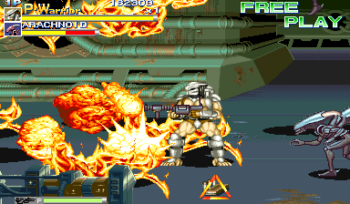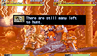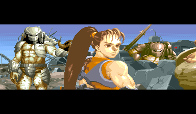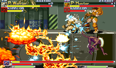 | All of the stages in this game are nice, with beautifully detailed hand-drawn backgrounds and lots of stage interaction like breaking doors, barrels, turret guns, elevator switches, street signs, crates, etc. The backgrounds fit the theme of the game perfectly, and keep fans of the two series at war satisfied. Also a nice note is that the game's stages change and fit the change in enemy presentation throughout the game; there's a shift in the plot of the game, and through this the game's stages compliment the new enemy encounters nicely. As the plot progresses with each The theme of the game says the Aliens have turned the place into "a living hell!", and that is exactly what most of the stages show. The soundtrack and effects that accompany the stages also satisfies - the tunes fit each mood for each plot twist in the game, and consists of classic Capcom trademark sound effects. Through most of the game you'll fight to the serious, mysterious, fearful, dark , heroic soundtrack, while at other times you'll hear a sort of melodic fantasy tone like that of the music in D&D; I think the mix of soundtrack styles in this game is also a plus, since the game sort of disregards consistency. Overall, I'd have to say my choice of music goes to Armored Warriors, but that is because I'm just more of a fan of the pulse-pounding, fast guitar type of background. Each hiss, slice, hit, yelp, groan, yell, battle cry, thud, explosion, and plasma shot sound great and definately add to the experience of the game. As mentioned earlier, the voiceover for Linn Kurosawa fits her perfectly and is an amazing voiceover, while the victory and battle cries of the Predators are amazingly nice and faithfully recreated. | |
