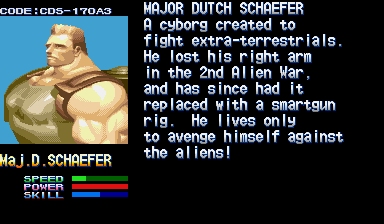 | Dutch Schaefer is the powerhouse of AVSP; he plays like Haggar from Final Fight, with powerful slams and special moves. His slams are powerful and clears enemies quickly if used correctly, but he lacks the speed that the other characters in the game seem to have to their advantage. Dutch uses a huge machine gun for battle that can be utilized in the air or on the ground, emitting a spray of fire across the screen low and high. One of Dutch's most effective moves is the Dash that acts as his Jump; since Dutch probably can't jump with that heavy machine attached to his body, he instead uses a quick and powerful dash as means of quick evasion. The Dash can not only mow down tons of enemies, but it can also act as a lead-in for the aerial machine-gun fire Special Move he has. His combos are standard large character combos, with slow hits that do massive damage but have ludicrous recovery time. Once the timing of his hits are mastered, though, he can quickly prove a force to be reckoned with. His slams aren't terribly complicated, and bounce him minimally to safety so he can plan his next assault. The Body Slam is great for clearning the screen efficiently, while the alternate slam Special Move is better for bosses or large enemies like Chrystalis. His mounted machine gun is good for in-close fighting, whereas the air fire is more suitable for air-to-ground assaults to buy time for the next move. One disadvantage compared to every other character in the game is his single screen-clearning Special limitation, with only an Electric Cyclone for those hard times in the game when the screen is the enemy. Is he better than Haggar? Well, you're dealing with Arnold here (yes, he was "Dutch" in Predator), so you have to be careful when basing such comparisons! So, to base a more fair comparison, I say he is like Haggar but with some slight tweaks to give his fighting style some diversity by allowing him to pick off enemies from above with his Special Move fire. | |