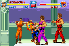 To start, Final Fight One has a completely different title screen, a re-drawn character select screen, new lifebar design, new enemy and player lifebar portraits, and a new design for the score ranking screen. The new font used in the interface is actually that of the fonts used in Street Fighter Alpha 3; this game has a many design influences from SFA3 which are addressed throughout this article. One of FFO's most refreshing additions is the added scenes within the game, in which the character you have chosen and the bosses exchange brief dialogues, revealing several points of the game's story. Each character has unique scenes, and exchanges their own unique conversation with the various bosses. In addition to the those scenes are also two hidden characters in the game (I'll get more into this later) who share their own individual and impressive stories as well. With the added scenes are also the new set of illustrations for the bosses and the playable characters, which look clean and vibrant; the coolest new illustrations are for Abigail and Sodom. Also, as far as the illustrations go, there is some artwork from Street Fighter Alpha 3 used in the pre-boss-fight dialogues as well, with Sodom and Rolento's VS screen and win portraits. Of course, the most important new feature is the inclusion of the two hidden characters: Alpha Guy and Alpha Cody. Alpha Guy and Alpha Cody are the versions we affectionately know from the Street Fighter Alpha series; Guy with his 'new shoes', and Cody in his 'jailbird' outfit. How do they fare against the age-old Mad Gear thugs? Pretty well, actually - it seems they are hidden for a reason, and that reason is because they work circles around every enemy and boss in the game!