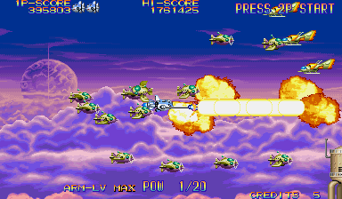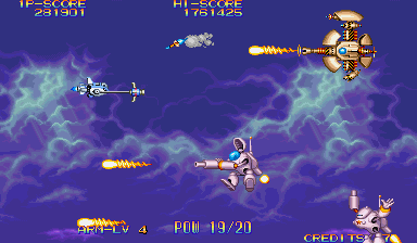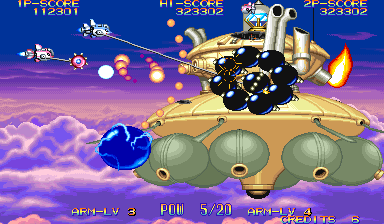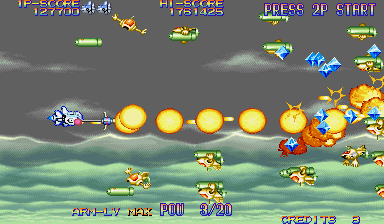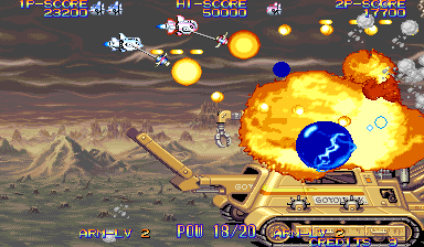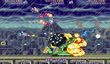 Especially with two players on the screen, collision is very hard to avoid, and it becomes almost second-nature to be strolling in the park, enjoying a nice Summer day with birds singing until an enemy ship rams into you. In manic shooters you have to worry about finding safe spots in waves of bullets, but in EcoFighters you have to worry about not running into or getting smashed by stray enemies. The gameplay of EcoFighters is that of a solid shooter, but the game loses a bit of its appeal when you find out that 90% of the time your deaths will be not from enemy fire, but because some bastard ship that your shots somehow missed flew directly into you. Your Arm weapon can stop some ships before they collide with yours, but in the later stages it is very rare to see an enemy ship stop dead in its tracks before it hits you. The visuals of EcoFighters are pretty good, and surprisingly are able to keep up with that of other newer titles that I have seen running right next to it. The player's two ships have a somewhat odd design, and some of the enemy ships are really different than what you see in other shooters (some look like they just walked out of a Megaman game), as well as a few organic enemies here and there, but you get used to the game's uniqueness and come to appreciate it. There are tons of little animated tanks, trucks, and tractors (similar to that of U.N. Squadron) on the ground, as well as various other flying contraptions and mid-bosses that animate in the fluidity we have come to expect from the CPS-II hardware. EcoFighters contains a fairly big set of enemies to destroy; some enemies are common and show up in nearly every stage, while others show up only once or twice in the whole game. There is a nice variety of enemies big and small, to blast in this game. Some of them aren't as cool or sleek as that of other shooters that bear Capcom's name, but I guess it makes it easier to destroy them without feeling guilty. In addition to the animation of the various enemy ships, the mid-bosses and bosses go through aesthetic changes as you shoot them. For example, some of the fish enemy ships can get their faces blown off, while other ships leave gears and other parts exposed after lots of abuse. Some enemies even go through more than two or three aesthetic changes before expiring; this is definately a visual plus, because it's just cool to see enemies fall apart when you give 'em hell. Maybe some animation had to be sacrificed to actually make the enemies show damage, but it is well worth it to see the enemies show damage because it looks cool, and because the player can actually tell they are making progress. The various aforementioned shots, missiles, beams, and other hazards animate well, in addition to the many explosions you'll encounter in close boss battles. Not completely sure about this, but a lot of the explosions in EcoFighters look like they may have been used in 19XX as well. Also, some of the shot collision sparks seemed to look a bit familiar, like they came from Capcom's CPS fighter, The Punisher.