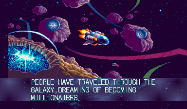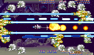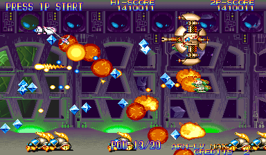 Somewhat like Psikyo's awesome Zero Gunner 2, in EcoFigters you can circle around the bosses, mid-bosses, or enemies and rotate your Arm weapon to shoot them while you are circling around them to consistently deal damage. This is an especially difficult but essential aspect of the game to learn, as it helps when bosses chuck out bullets at the speed of light. However, unlike Zero Gunner 2, where you can rotate around an enemy ship and shoot until expiration without having to worry about other ships smashing into you, in EcoFighters when you try the same thing you get obliterated by enemies that conveniently appear too close to even stop. This aspect, combined with the difficult usage of the Arm weapon, makes EcoFighters a difficult shooter to grasp. The alternate weapons (Vulcan, Bomb, Homing) help in dealing damage, but the Arm still has to be utilized fully to keep your ship from bursting into flames. Set the steep learning curve of EcoFighters aside, and you got yourself a solid shooter. The seven stages of EcoFighters are fairly quick, neither too short nor too long, scroll horizontally and vertically, and feature frequent boss fights (like Treasure shooters). The length of the stages in Ecofighters is one of the game's good points; it's not one of those shooters where the stages are so damn long that you are asleep by the time you get to the boss. Those who like lots of variation in shooters will probably like the stages in EcoFighters because of the mid-boss fights Capcom put into each; rather than continuous enemy-blasting, enemies are dispersed inconsistently and spaced by frequent mid-boss battles until the boss is reached. The mid-boss fights are fun, and are a good change of pace if you play primarily the type of shooters that throw at you continuous battling followed by the stage boss. The game reminds me of a Treasure shooter, in the way that mid-boss battles are a crucial part of the game's stage layout. Some of the mid-bosses are good, while others are just downright cheap all the way around. The most terrible fucking mid-boss in the game is a swirling scrap heap that, after you destroy most of it, flies directly toward your ship and takes you almost everytime. Bullshit. This boss could have been left out of the game. The enemy uses standard bullets, lots of missiles (that can thankfully be shot), various unstoppable lasers (oh man..), bombs (that explode into the standard bullets), big flames, bubbles (think Gradius), and tons of stray rocks to dispose of you in a timely manner. The variety in all those different hazards is good, but man, when I get killed by a stray rock that shot out of a pipe, I can't help but thinking of the word cheap (in Japanese and English). Enemies can be destroyed either by shooting them with the Arm weapon, shooting them with the ship gun (via Vulcan, Bomb, or Homing), or by hitting them with the Arm up close. Arm Power-ups are plentiful in this game, and thankfully, so are the level-up crystals that make your ship stronger. The abundance of Power-ups in this horizontal shooter is not nearly as bad as that of R-Type titles (where you get too many), and the game is still challenging even when you are maxed-out. Plainly put, EcoFighters is a challenging shooter. Even as early as the first stage, the player is given some tricky enemy formations to shoot down, and in later stages boss fights can get really ugly. At first glance, one would write EcoFighters off as a mere kid's game by looking at its design, but that couldn't be farther from the reality that this game is a serious shooter that will rip your ass apart. Unlike the most recent shooters Capcom has released (Mars Matrix, Progear, Giga Wing, Dimahoo), the gameplay of EcoFighters is more like the older Capcom shooters (U.N. Squadron, 1941, Forgotten Worlds) in the way that it focuses on the number of enemies on screen rather than the number of bullets on screen. EcoFighters usually has a good amount of enemies on the screen, and sometimes you will get a good amount of shots flying around, but it's nothing like the shot madness you see in 19XX, Mars Matrix, GW2, Progear, or Dimahoo. I'm not sure if some classify this as a manic shooter or not, but I don't think it really resembles the constant bullet-flooded screen of a manic shmup. Ecofighters could be seen as a mix, with elements of both manic and technical shmups rolled into one. Of course, with this kind of shooter, one of the most common ways you will lose ships is not by shots, but by collision with the enemy (just as in the R-Type titles).