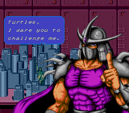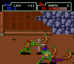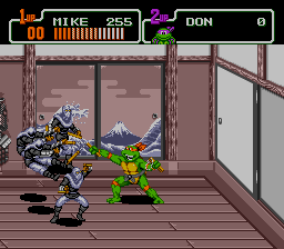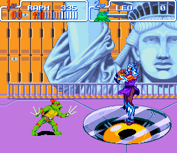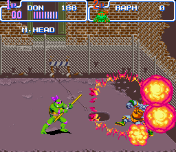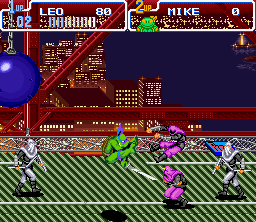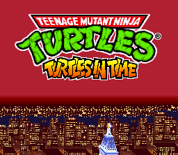Teenage Mutant Turtles - Turtles In Time is not only my favorite TMNT game, but also my favorite Konami side-scrolling action game. The best of side-scrolling action. This game pushes weight in more areas than one. First of all, it's the turtles, so I almost instantly like it; and second, it's a side-scrolling action game from Konami. With this deadly combination, I was sold on this motherfucker right away. Konami did a great job of animating the turtles and at the same put each of their unique respective personalities into the animation as well. There's nothing better than beating the shit out of foot soldiers, and the great thing is that in this game you can carry out that task in many, many ways. You can really really rock their shit in this game once the action gets thick. This is the first Konami side-scrolling action game where you can grab an enemy (foot soldiers) by the arm, fling them side to side, bashing them repeatedly, taking out any others sorry enough to be in proximity. The turtles have at their disposal large array of ground and air attacks to use against the forces of Shredder, in addition to a Special Move unique to each turtle. The turtles have several attacks in TMNTTT, including kicks, dashing shoulder rams, multiple jumping attacks, a dashing slide, standing attacks, and even a back hit that quickly disposes of enemies behind you. Of the attacks, the most notable and coolest is by far the ability to throw foot soldiers toward the screen. Definitely one of the best things about the game is the fact that you can do this move, and to go with it the turtles have two different animation sets for it. The green heroes have some nice attack animation and each have their own individual special attack that does a load of damage. TMNTTT has a generous array of moves for the heroes, and while not completely hard to perform, the moves still take practice to use efficiently. Sure, they don't bring anything completely revolutionary to the table or anything like that, but the fact is that the moves give the game a certain factor of intricacy not found in Konami's other side-scrolling action games. The stages in this game are also the best of all in the TMNT series (nice details can be seen in every stage); easily the best of Konami's side-scrolling action games. Every stage is so completely unique because in this game the turtles travel through time; in "Prehistoric Turtlesaurus" Foot Soldiers ride dinosaurs, in "Bury My Shell At Wounded Knee" battling takes place on a moving train as Foot Soldiers jump onto the train from horses. By far though, the best stage in the whole game is "Neon-Nightriders", a futuristic stage (see right) with a city skyline of ethereal beauty to view while fighting the forces of Shredder on a freeway. The action in this game is great, with lots of big fights, explosives, and stage interaction (just as in the other TMNT games). The action gets frantic, with the turtles, foot soldiers, and rock soldiers, or those bastard machines on wheels that electrocute you, all battling it out on the screen at once. Combine this havoc with the stage obstacles and you've got hell on your hands. Every stage in this game is chock-full of explosions and other environmental obstacles like ice floors, giant wrecking balls, tumbling barrels, and falling ceiling spikes. Obstacles in each of the stages make the action thicker; sometimes giant cannon balls are shot directly at you while fighting, or wretched beams shoot from the walls. The Foot Soldiers are in much larger variety and have more attacks in this game than in TMNT; Foot Soldiers throw shurikens, swing nunchakus, wield axes, use swords, fly mini helicopters, throw boomerangs, heave bombs, and shoot arrows. The Foot Soldiers in the first TMNT game were a sight to see in all the different animations they had, and in this game there's even more animation as the Foot ride dinosaurs, drop from the sky, jump kick, and stand in various fighting styles. An aesthetically great thing about the foot soldiers in this game are the many ways in which they make entrances - some foot soldiers jump over fences, appear through the floor in liquid form to solidify, while others appear through teleporting in some stages. There's just something so great about eradicating Foot Soldiers that I had been fond of since the first TMNT action game, and tearing them apart in this game is just as fun; Foot Soldiers are not only a cool enemy to beat up on, but they are just a cool enemy in general (oh, believe me, it can get worse). It's just great when you are surrounded by foot soldiers in this game, and then, in the blink of an eye, you let out a special attack then sends all of them in different directions to certain death. As if fighting against varieties of foot soldiers wasn't enough already, the game also pits you up against various rock soldiers, those bastard machines on wheels, laser machines on rails, and pizza monsters. The bosses in this game are also good, with the typical Krang fight, as well as some fights with Leatherhead, Metal Head, Tokka, Razar, Baxter Stockman, and Shredder. The best, most intense boss fight in the game is probably when you fight Krang in his ship - he drops out laser spitting floor enemies while teleporting and flying across the screen, encasing the turtles in giant bubbles - awesome. The sounds in this game are good and fit the turtles just as well, if not better, than in the previous TMNT entry, with loud explosions, hits, battle cries, and the beautiful sounds of machines.