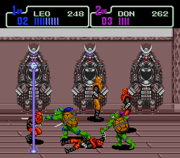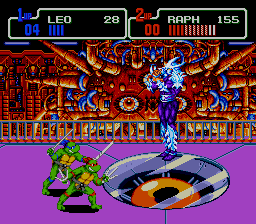 In addition to the various foot soldiers to obliterate, TMNT The Hyperstone Heist combines bosses from Konami's previous TMNT entries and a new boss, along with new versions of the old bosses as well. The great thing about this TMNT game is that is combines that of the previous two games, so bosses from the first TMNT like Rocksteady and Baxter Stockman make their appearance in the company of the bosses from TMNT Turtles In Time like Leatherhead, Krang, and Super Shredder. Still, to add to the mix, there's one completely new boss who is hard as hell and beats the living shit out of you - Tetsu. This pain in the ass martial arts master calls out foot soldiers and then flies across the screen in a fury of short flying arrows. I think this has got to be one of the hardest bosses in all of the TMNT games (almost as hard as TMNT Shredder). Another interesting boss feature is how in one stage you have to fight alternate (pissed off, differently colored) versions of Leatherhead, Rocksteady, and Tetsu! If you thought the first battles with these jerks was hard, don't bother with their more aggressive alternate incarnations (especially Tetsu). Though some of the stages from the previous TMNT entries are in the game, the bosses aren't found in the same stages they once were; for example, Leatherhead is the first stage boss (as opposed to TMNT Turtles In Time) and is in the second stage of the first game. Confused? As aforementioned, TMNTHH combines some of the elements of the previous TMNT games, so in this case Konami put Leatherhead as the boss of the first stage, which was the second stage in the first game (the sewer). The battle with Krang in this game is also different than that of TMNT Turtles In Time respectively, because although you fight the mobile Krang that in TMNTTT was in a futuristic riding stage, in TMNTHH the fight is with the mobile Krang on foot in the stage that used to be the battle ground for the spaceship saucer Krang boss fight! And yes, he still has all the attacks he used in "Neon-Nightriders", too (fire from Krang's mouth to the sky). The changed boss locations in this game make for an interesting twist in the gameplay, and is a definite strong point of the game. It also seems like the bosses are harder than in the previous TMNT games; they give you a lot of shit before they start to flash, and then they give you even more shit before they finally die. Though two players might be able to make short work of some of the bosses with a little work, others are still a stiff challenge, and in single-player games prove to be downright ruthless if given the chance (purple Leatherhead is a jerk). As briefly mentioned in the boss talk, the stages in TMNTHH are actually a mixture of original stages ("A Mysterious Ghost Ship," "Shredder's Hideout," "The Gauntlet"), and some stages from TMNT (New York sewer) and TMNTTT`("Alleycat Blues," The Final Shell Shock"). The stage variation is probably the game's second strongest point; the stages from TMNT Turtles In Time are improved with different hues and some other nice aesthetic changes. And just as in the previous two games, TMNTHH has stage hazards (open sewer lids, spiked ceilings, crushing gates, wrecking balls) and interactive stage elements the turtles have before used to kill the foot (explosive barrels, parking meters, signs, sewer lids). As in TMNTTT, you can also get the 'School Of Hard Knocks' item that allows you to spin around invincibly, but in TMNTHH it seems to be a shorter time limit with less time to destroy. The cinematics in TMNTHH are fewer than those in TMNTTT, but are just as good - the layout of the scenes is similar, with cool new artwork (see screenshots) and dialogue. The in-game dialogues are also goods, and are completely different from the past TMNT games. Of all the scenes, the most amazing in this game is almost completely similar to the best scene in TMNT Turtles In Time - the transformation of Shredder into Super Shredder! Thankfully the scene was put in this game; it's the absolute most amazing scene in any Konami game. You walk in and see Shredder levitating off the ground in the center of a beam, then he turns into Super Shredder. Just look at the screenshots. Brilliant. The music and sounds are pretty much all from TMNTTT (save for 1 track), and as before sound great; the best music is on the surfing stage before the ghost ship is reached (it's the same music from the future stage of TMNTTT). Lastly, the game's presentation; I think Konami did a very good job on the presentation of this game because they improved on an already great game (TMNTTT) in an already great series. Definitely high on my list. I've played both TMNTHH and TMNTTT extensively and it's still a hard choice to decide which is better; both are good games in every aspect. TMNT Hyperstone Heist, in its simplicity, is a good game no doubt, but at the same time every time I play TMNT Turtles In Time, and I am still amazed. Not to say that I am not amazed with TMNTHH, but TMNTTT when it came out, it blew my fucking mind. Did I feel the same when I first played TMNTHH? Actually, I did, so that's why I give both games complete respect for the different aesthetic approach each takes. I'm always a fan of sequels, so I rank this game high on the list for having so many similarities with TMNTT, but at the same time using those things that made TMNTTT so great towards a different presentation. TMNTHH is right under TMNTTT due to the good stage design, gameplay, and presentation. TMNT Turtles In Time is a longer game in its entirety, in gameplay, enemies, and bosses, but TMNT Hyperstone Heist is deeper in gameplay due to the inclusion of the Dash button and added attack animations. TMNT represents the series faithfully, and definitely lives up to the traditional quality that the previous two TMNT games set. |