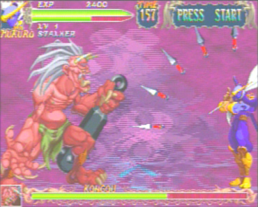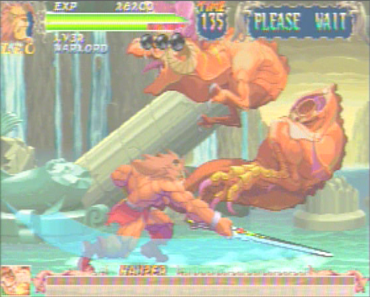 While this is only four characters, each has a long list of moves when maxed out. Like any other fighting game, they have their respective strengths and weaknesses. As for the CPU opponents, there are only eight; from Hauzer, an earth dragon with thick skin and firey attacks to Nool (Hydron) an aquatic creature who uses ice/water based attacks to Luan (Lavia) a bird-woman who attacks from the air and is annoyingly swift. They too have their weaknesses against certain elemental attacks, as well as their own moves and/or 'Super' Moves. Unfortunately, there is no code to play as any of the CPU opponents or any secret characters. I will tell you that WZ is a fighting game. You have your joystick and six buttons (3P/3K). Typical Capcom stuff, right? Yes, but it gets different in a lot of ways. When playing in 1P mode, the 'best of three' concept goes away. It's just one round. Lose and be prepared to insert another coin. As your level goes up, the enemy's life increases. (more on levels in a bit.). Also this game revolves around experience points. This value is basically your score. as you you hit a certain score, your level increases. Also the "Super Moves" are not as you know it this time around. You can only do them when you have Magic Orbs, which you can use for an Elemental Attack using 214+3P. WZ isn't exactly one of the more combo-friendly games, but some nice stringing can be pulled off here, too. This game is notorious for "guard cracking" when your guard breaks from blocking too much in period of time. One sure fire way around that is to use the "Ultimate" guard, which is done by pushing the same strength P+K. This will let you block any - and everything - with no damage at all. The only catch is that you can't do this in the air, and the lag from recovering from this can cost you some valuable life. As for the moves, you only start with a few and earn more as your level increases. A good thing is that they are all simple circular motions of some kind. Nothing at all as intricate as any SNK moves, but easy enough to where you can link regular moves in to special moves. Some moves, however, can be obtained by having a high enough level and "Vs. points" (from 2P matches). After finding the passwords that include these moves, I'd easily say that they are well worth the effort. Super Moves are done with the 'typical' Super Move motions (like 236236+P), but require you to have a Magic Orb to do them. The level up system not only gains you moves at certain levels, but also affects your strength and your defense against certain elemental attacks from the enemy. As the level increases, the points needed to advance get higher. Sometimes it make take a complete play-through to gain one level. Bonus points are earned by collecting coins that appear in random treasure chests throughout a fight (as well as food and even Magic Orbs), and of course from finishing a CPU opponent in a certain way, remaining vitality, time, etc. The game can be finished at any level, but the game is much better balanced as you have more techniques to take on the opposition. As for the endings, they are usually based on descisions (yes/no) that you make, or factors in game play (like how you finish a certain opponent, for example). Every character has a good and a not-so-good ending. WZ has great graphics. The backgrounds are deatiled and imaginative, but in a way charmless, since there is not a lot going on (if anything at all). You'll immediately notice that some characters have a lot of animation. One of the better examples is Nool (Hydron). That's largely because of the extra RAM that the system can run. Even the non-player characters in the game sport a fair amount of animation, as well. The endings are nicely drawn too. Like the later games to come in the CPSIII family, you get a good share of zooming effects to the point where it doesn't take a way from the gameplay itself. The sound in WZ does seem fitting of the game. While some of it is forgettable, there were a few tracks that did grab my attention (like Leo's vs. theme). Is it me or do a lot of the tracks have that drum beat in it? Oh well. The voices are cool too. What's really interesting is a lot of the voices were removed or changed between versions. Tao's "kujuu-ken!" has chanced to a simple "aaay!" This announcer is also definitely one of the coolest ever, with his deep pseudo-evil voice. Another feature that is unique to WZ is the password system. With this, you can keep your character's level and abilities, but must begin the game from the first battle. By continuing, you also keep your current level and the enemy's life meter stay at about the same point when you lost (give or take a few points). Overall, War-Zard is a decent game, though it has its obvious flaws. Many hardcore fighting fans may try their luck for a round or two, but my be scared away from the eventual lack of replay value. I only like it because I want to play it on the same level that the experts go to Super Battle Opera with on SSFIIX. Collectors might find this game to be a treasure since it wasn't widely released in the rest of Asia and the Japanese kits can be obtained for cheap. If you ever see this game, buy it or play before it does fade into total obscurity. |