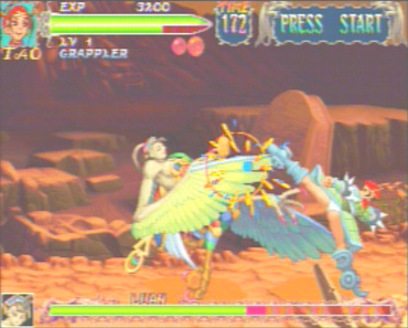 Let's rewind back to the year 1996. For Capcom, that was a good year in the arcade scene. They had Super Puzzle Fighter II X, X-Men vs. Street Fighter, 19XX, and even Mega Man 2: The Power Fighters as part of their powerful lineup for that year alone. The CPSII system is doing incerdibly well. Will Capcom stop there? No. This is also the same year they pilot their newest system, CPSIII. Since Capcom's 'fighting engine' has done so well, they decided to make a variation of it for their first CPSIII game. What was the first CPSIII game? Street Fighter III New Generation. Is that your final answer? If you said no, then good on you, because it was not the first CPSIII game. It was the very little-seen War-Zard (Red Earth for those who paid any attention to it in the states). It was talked about for a long time, but axed because it was just "testing the power of CPSIII." For what? SFIII, of course. Because of this, Stateside gamers barely got to see this game (if at all), but it did get to stay in Japan. Throughout my travels, I finally got to see this game in late 1997, with an aspiring hope to someday own one for myself. Now that I do (thanks to Shou-sama), I'll be going in depth on this one since few resources never really bothered to put out enough info for the curious. War-Zard takes place in the year 1999, in a world where the big bad guy, Valdoll has caused horrible things to happen to the world (where in the U.S./Asia version, the game takes place "in the year of Our Lord, 13XX"), and it's your job to take out the eight monsters around the world and finally Valldoll himself (he's called Scion everywhere else). You choose from only one of four characters (perhaps a big setback for this game): Leo, the lion-headed former king with some mad sword skills; Mukuro (Kenji), Master ninja with a wide variety of attacks and the matching quickness; Tao (Mai Ling), acrobatic teenage girl fighter who is like Chun-Li in ways; and Tabasa (Tessa), Super Gem Fighter/Pocket Fighter starring with who attacks with anything from cats to cannons, to doves and swords!
