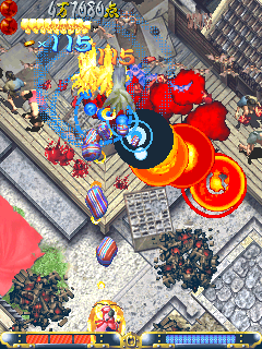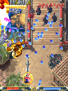Guwange's gimmick, however, is the making of it. Each character has a sidekick of sorts, an ever-watchful guardian demon and holding down the fire button deploys it. Pushing the stick with the button held down moves the sidekick, slowing the player to a crawl, still able to dodge an incoming barrage and move around obstacles yet more concerned with "painting" enemies with the guardian. Further complexity means when it passes over enemy shots, they grind to a halt, if briefly. This touch of The Matrix is a rare epiphany, when you realize you can't pass unscathed through that hail of fire; easier to stop a handful of them in their tracks for a moment, slipping through the gap left behind. Add to this the possibilities for score attack and you suddenly begin to wonder where the time went. Though enemies drop tokens when killed, judiciously powering up the guardian (through killing something with it) and then painting any frozen bullets with it turns them into still more coins, pushing your points even higher. Inventive or not, it is still prohibitively difficult, but not as intimidating to the newcomer as a Mars Matrix or a Giga Wing 2. Cave's hardware is showing its age, yet Guwange is still