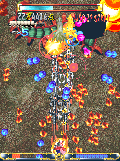 For those supposedly forgotten genres lacking populist appeal nothing less will do, to satiate their long-time fans, than constant pushing of the envelope. Devotees of the shooter, veterans of countless classic titles across more formats than the PlayStation generation ever dreamt existed demand their skills be tested to the limit. Japanese devco Cave are credited by many with inventing the "manic shooter" in 1996's DonPachi and its sequels; a distillation of the genre where the player spends forever in "the zone". Tiny, almost unconscious course corrections keep one's on-screen avatar darting constantly between bullets spewing across the level by the hundreds. Guwange is little different. Enemies march out of hiding,