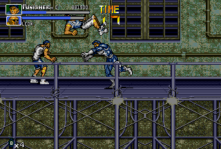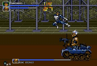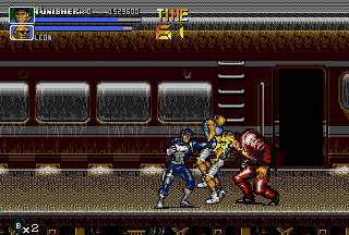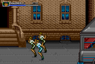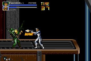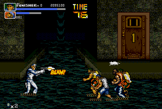 Having played the game only a few times during its initial arcade release, I had always wanted to play the game in its entirety and learn its intricacies, but never had the time nor the funds to do so. So, as expected, I was especially hyped when Capcom brought The Punisher to the consumer via the Genesis hardware. Playing the game at local arcades was great, but there was nothing like having the game in the comfort of my own home (to play as much as I wanted with no limitations). Of course, the lowlife assholes at GamePro had lots of shit to talk about this game upon its release, but as one who actually plays games, I'm saying that The Punisher delivers side-scrolling action goodness. This one is a bit hard to track down (especially new), but this is one side-scrolling fighter that can't be missed by Capcom or Marvel fans. Capcom did a great job in making the game accurate to the Punisher and Nick Fury comics, right down to even the smallest details. This was yet another reason for me to love Capcom back then, and is still a reason to this day even when the developer's most recent works are considered. As the name suggests, this game puts you in control of the killing machine affectionately referred to as The Punisher. There's nothing like actually playing as the character that I could only read about before. The Punisher just kicks ass in this game! His animation is cool to watch; even in his walking animations he looks just as hardened and pissed off as in the comics! Although the Punisher usually walks alone (except when sometimes assisted by the trusty Microchip), the hard-hitting Nick Fury fights at his side in this game. I thought Nick Fury was a cool character back in the days when he had his own comics, and it's cool to see him fight valiantly next to the best character in the Marvel universe. I think Capcom made an especially good decision in choosing the hard-hitting Nick Fury to fight alongside the Punisher; it's hard to find another character that fills the void as good as Nick Fury does. Together the Punisher and Nick Fury set out to dethrone the tub of shit commonly referred to as the Kingpin. This is the duo that destroys. Familiar villains from The Punisher comic series also make appearances throughout the game, like Bonebreaker, Pretty Boy, Bushwacker, Jigsaw, and The Kingpin. Kicking Bushwacker's ass is fun, and putting The Kingpin in his place (six feet under) is cool, but I like going up against The Reavers (Bonebreaker and Pretty Boy) more than anything; these assholes nearly killed The Punisher before in the comics, and any fan of The Punisher would feel content getting revenge on these jerks in the game. Nearly every cool character that the Punisher fought in the comics shows up, from the persistent Jigsaw to the asshole Kingpin, but I would have liked to see Dr. Doom in the game. Seeing The Punisher fearfully "surrounded by Doom" in an earlier issue of the comic series, I would have liked to beat the shit out of Doom if he were put in the game (for being a jerk) just to bury that memory. However, Dr. Doom wishes set aside, the bosses in the game are good and fun to fight against. Not to be left out, The Punisher also gets to smash the lowest of the low; enemies in this game range from dirty thugs (Max, Chrys) and knife-weilding jerks to gun-toting assholes (Jagger, Luis Allegre) and beefy troublemakers. There are even a few enemies that carry axes and katanas, who are probably the most fun to fight because you can kick their ass and then turn their own weapons against them (it becomes a sick obsession real quick). The Punisher's enemies seem a bit more aggressive than in other Capcom titles of the same genre; they have nasty jumpkicks, throw lots of knives, slash with axes and katanas, and shoot at you more than often. Get cornered in this game, and it's all over for you; it might take a bit of swearing and losing before you actually get used to how aggressive they are. While not on the side of the opposition nor the Punisher, one character design I think is absolutely awesome in The Punisher are the business women (office ladies, if you will) that are seen throughout the game. Running from crime scenes and locked in prisoner cells, these hotties reward you with sensual hugs if rescued, and sometimes even leave a pizza behind! Now that's what I call debt repayment! Drawn in the style only Capcom can produce, they animate perfectly; when they run away from crime scenes or out of cells, they animate beautifully. Don't believe me? Play it and see for yourself! For fans of OLs, The Punisher is a must-play. Definitely, the animation of these ladies shows the game's style. As in other Capcom side-scrolling fighters, The Punisher features an Attack button and a Jump button, which are used to perform the various normal, jump, and special attacks. The Punisher is set apart from other side-scrolling fighters of its time (Final Fight CD, Streets Of Rage 3) due to the large number of attacks that can be performed with just two buttons. With just two (Attack and Jump) buttons a ground attack, jumping attack, dashing attack, throws, and various special attacks can be performed. In most side-scrolling fighters there's usually a throw, but in The Punisher there are five different throws; both the Punisher and Nick Fury can perform a ground throw, an air-throw, an alternate air throw, a special throw, and downed enemies can be picked up and thrown. In addition to the standard air-throw, there is also a second air-throw in the game appropriately called the Izuna Fall; a move that takes the enemy right-side-up into the air briefly and then upside-down back into the ground headfirst. Now that is an air-throw! The Izuna Fall can even be aimed (to a certain extent) to hit selected targets; this is an especially effective tactic in creating breathing room. Also, nearly every downed enemy in The Punisher can be picked up off the ground and tossed with a move called the Death Lift; moves
