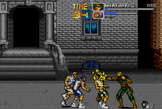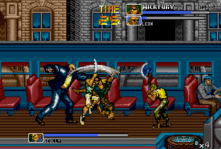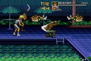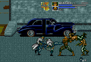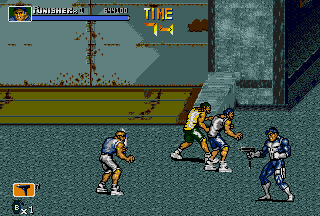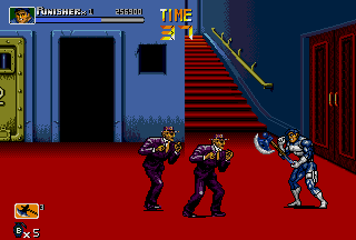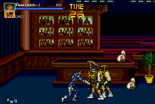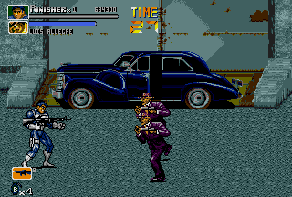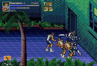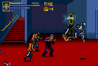 Ultimately, throws are so unique to The Punisher simply because in most side-scrolling fighters various executable throws aren't that common (even in the later titles of the genre), let alone two air-throws in one game for each playable character. Following the various throws, there are also various different special attacks; both the Punisher and Nick Fury can do a ground area-clearing Sure Killing Technique that drains a bit of energy (like in Final Fight); Punisher does a spinning sweep kick that floors everyone around him, and Fury swings around a bar (?) that clears the area. In addition, the Punisher and Nick Fury also have their own unique special attack to use in battle; the Punisher has a quick roundhouse, and Nick Fury has a somersault kick. Both characters can also put their special attacks into ground combos to create devastating results. Just seeing the moves connect might give you a slight toothache. I wasn't sure how to really classify these, but there are also highly effective dashing attacks in the game that literally "floor" enemies upon impact; the Punisher has a dashing sidekick, and Nick Fury has a dashing high kick. Destroy. Yet another aspect unique to The Punisher is the ability for both characters to draw guns and use grenades at will. Perhaps one of the most striking aspects of the game, The Punisher and Nick Fury have the ability to draw their guns and engage in gunfights. Triggered when enemies with guns approach, the gunfights in The Punisher are just plain nuts. Fucking nuts. After your character draws their weapon, get ready, because the screen just explodes into war. This is the essence of The Punisher. I don't want to beat a dead horse here, but besides Capcom's own Cadillacs & Dinosaurs (and the later Alien VS Predator), intense gunfights are a bit rare in side-scrolling fighters. In addition, the Punisher and Nick Fury can throw grenades by hitting Attack and Jump simultaneously while in the air, which douses the ground below and all of its occupants in glowing flames. Throwing grenades is one of the coolest (and most fun) aspects of The Punisher's gameplay; there's nothing like recovering from a cheap-shot and then lobbing a grenade at the bastard who did it! Capcom did a good job in making The Punisher true to its comic roots; the gameplay is furious. The Punisher's gameplay is faster and meaner than other Capcom titles of the same genre like Final Fight CD and X-MEN - Mutant Apocalypse. The gameplay is fast, attacks are fast, and the gunfights are fast. At any given time, there can be up to four enemies and two players battling; battles range from all-out brawls to intense shoot-outs. While normal standing attacks are performed in order create combos, in The Punisher these combos can be canceled (by both fighters). While it may seem to be a sort of disadvantage at first, canceling combos knocks enemies down quickly and makes back defense easier; while throws can also be used for this same purpose, cancel combos work nicely. With dash attacks, rolls, grenades, and cancelable combos, The Punisher's gameplay stays at a frantic pace unlike few games in the genre. There are instances in this game that are absolute chaos; the screen more than often erupts into gunshots and explosions. The most distinguishing aspect of The Punisher's gameplay is the sheer amount of weapons in the game. When it came out, there were few games in the genre that could match it in terms of weapon selection. Weapons in the game include knives, baseball bats, pipes, axes, katanas, M-16 assault rifles, Uzis, flame-throwers, dynamite, throwing stars, chairs, and even rocks! While a crowbar or a board (with a nail through it) would have been cool to see, I'm satisfied with the many weapons of The Punisher. My favorite weapon, of course, is the axe; there's just something cool and refreshing about bringing an axe into a fight against a band of gun-wielding thugs. That being said, there's some bloodshed in The Punisher. A lot. There are parts of this game that can be considered small-scale massacres. While the bloodspill in The Punisher is nothing like that of Capcom's later Alien VS Predator title of the same genre, there's still enough to paint the walls. I have often heard The Punisher being compared to Streets Of Rage 3. While Streets Of Rage 3 is a quality title, and I think Sega did a good job on it, I still like The Punisher better. To start, Streets Of Rage 3 has four selectable characters (and maybe some secret) compared to The Punisher's two, but even with four characters (one of them an attractive woman) it's hard to beat the awesome duo of The Punisher and Nick Fury. Just look at The Punisher and Nick Fury as they plow through the Kingpin's minions; it's just beyond comparison! While the animation in both games is good (Sega put a lot into SOR3), The Punisher just has that signature Capcom animation that fans have grown fond of. The category The Punisher really beats Streets Of Rage 3 in is sound; in Streets Of Rage the background music is almost irritating at times, and the sound effects just don't sound as good. Not that the music in The Punisher is the best ever in side-scrolling fighter history, but I think it certainly fits the fighting better than the bad techno-fusion-inspired tunes of SOR3. Streets Of Rage 3 is a fun game, and the fighting is good, but I like the seamless, gritty action of The Punisher more; when compared to The Punisher, SOR3 can seem a bit slow at times (especially while waiting for fights or really long lifebars). Although SOR3 has running attacks, fights just don't seem to occur as consistent as those in The Punisher. One thing many might like more about SOR3 is that the fights just don't get as nasty; fights in The Punisher often escalate into shoot-outs, and things get really bad. Death doesn't seem to come as often in SOR3 as it does in The Punisher. Aggressive (and sometimes cheap) enemies set aside, I think The Punisher ultimately has bette