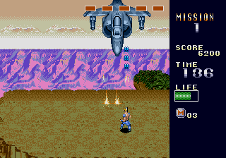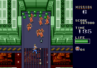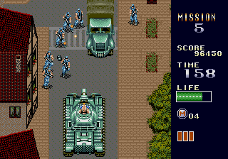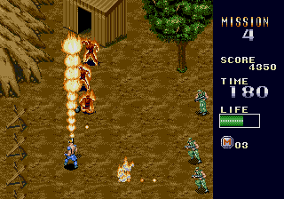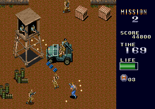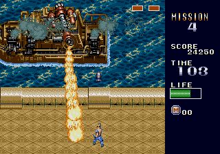 The real Mercs was made by Capcom and released in arcades back in 1990, with a home release on the Genesis in 1991. The sequel to the 8-bit Commando, Mercs is arguably one of the best action games ever made. The former President of the United States of America has been taken hostage by terrorists, and as a "skilled professional soldier, trained in anti-terrorist tactics," your mission is to rescue him at all costs. In Mercenaries (the new Lucas Arts game everyone mistakenly calls "Mercs"), the generic, tasteless character design is bullshit; the cover "art" for the game shows some old burnout idiot with a mohawk, some random guy that looks like he doesn't know what the fuck is going on, and some lady who looks like she can barely hold the gun she's been given (let alone perform the necessary duties of a mercenary). But in Capcom's Mercs, you're a hard-as-nails, pissed-off, balls-to-the-wall heavy-artillery-toting destroyer. No joke; just look at the poster for the game. When I was a kid, I used to walk to 7-Eleven everyday to play Capcom's Mercs (most of the time with money that I was supposed to be using to buy food or other essential items). It was fun back then, and it still is today (amongst all that is supposedly so great). It is a classic. Not because it was overhyped, but because it was actually fun. Screw all of the boring shit about sides and backstabbing that bogs down the Lucas Arts "Mercs;" Capcom's Mercs is a 2-D, free-roaming, vertically-scrolling action game where the object is to clear a path to the former president by destroying everyone and everything that gets in your way. Each of the game's varied stages are perfect in length (not too short, not too long) and feature a perfect mix of exploration, gunning, and strategy. The furious "run & gun" pace of Mercs requires a combination of acute reflexes and a keen-eye; enemy soldiers, gunfire, grenades, and rockets are constantly coming at you from all directions. And staying in the same spot equals instant death, so you must stay mobile to dodge enemy fire and collect power-ups (while advancing toward the boss at the end of each stage). Yes, Mercs is about mowing down as much of the enemy as you can at a time, but it takes skill to get through the game. The game puts you up against enemy soldiers (equipped with machine-guns, knives, and hand-grenades), monstrous tanks (hell-on-wheels with the firepower you'd expect), and various other destructive machines of war (which I'll get to later). So, how do you destroy the opposition? War is waged with semiautomatic machine guns, automatic machine guns, flame-throwers, and grenade launchers that are collected throughout the game. Each of the said weapons can also be leveled-up, and come equipped with a Predator-style rocket launcher so powerful that it launches enemies out of bunkers and clears whole areas. And just as enemy forces use jeeps, tanks, and other vehicles in battle, the great thing about Mercs is that you can, too. After gunning-down their drivers (and occupants), jeeps (mounted with machine-guns), tanks, speed boats, and even turrets are at your control. Everyone thinks that Lucas Arts' Mercenaries is so fucking great because you can "drive tanks" and all of this other shit, but it's nothing new; Capcom's Mercs did it first. Even today, I am still impressed at how Capcom's staff so perfectly integrated vehicles into the game as weapons at the player's disposal. While the 3-D Lucas Arts "Mercs" looks just as shitty as it animates (and plays), the 2-D detail and animation in Capcom's Mercs is great. The amount of detail Capcom put into the game is simply outstanding for its time; just look at the majestic scenic view from the cliff in first stage, the detail of the enemy soldiers, or even the camouflage on the harrier fighter jet and chopper bosses. The game's stages are even destructible, and unlike the Lucas Arts "Mercs," things don't just magically reappear after you've blown them up. It may not seem like it by today's "standards," but back then the detail was considered to be outstanding. The great detail in Mercs is accompanied by the signature quality animation you'd expect from Capcom's CPS hardware. The main character seems to be inspired by Arnold Shwarzenegger in the movie Commando, and shares an uncanny resemblance in animation as he runs around destroying and blowing shit up with heavy artillery in one hand and a fist-full of rage in the other. His body even kicks back and recoils with each shot! Just another reason I love this game: it's like an unofficial videogame adaptation of the killer action movie Commando. Even the enemy soldiers look like that of the movie Commando! They come in several different types, animate differently, and expire in several different ways; for example, frying them with the flame-thrower makes them drop to their knees in flames, while shooting them with a rocket launcher sends them high into the air. Enemy soldiers also shoot from bunkers and from vehicles, slide down rocky slopes, ride motorcycles, man turrets, and jump out of helicopters and trucks in groups. As aforementioned, the enormous bosses in Mercs are killer; a Harrier jet and Russian assault chopper are among the destructive machines you destroy. Smoke even even trails from them as they take damage, and parts come off (exposing their mechanical guts)! Without a doubt, some of the greatest bosses ever seen in an action game. Mercs was the coolest, best-looking game of its genre at the time. The audio in Mercs is, quite possibly, some of the best ever in a videogame. The music in this game rocks. Although the game features a wide-range of heroic war anthems, the intensity of the music in first stage alone is enough to get anyone fired-up to play, and each of the selections that follow are good in their own merits. There are even different themes for each of the boss battles! Now that's quality. The game also features a plethora of classic sound effects that throw you i